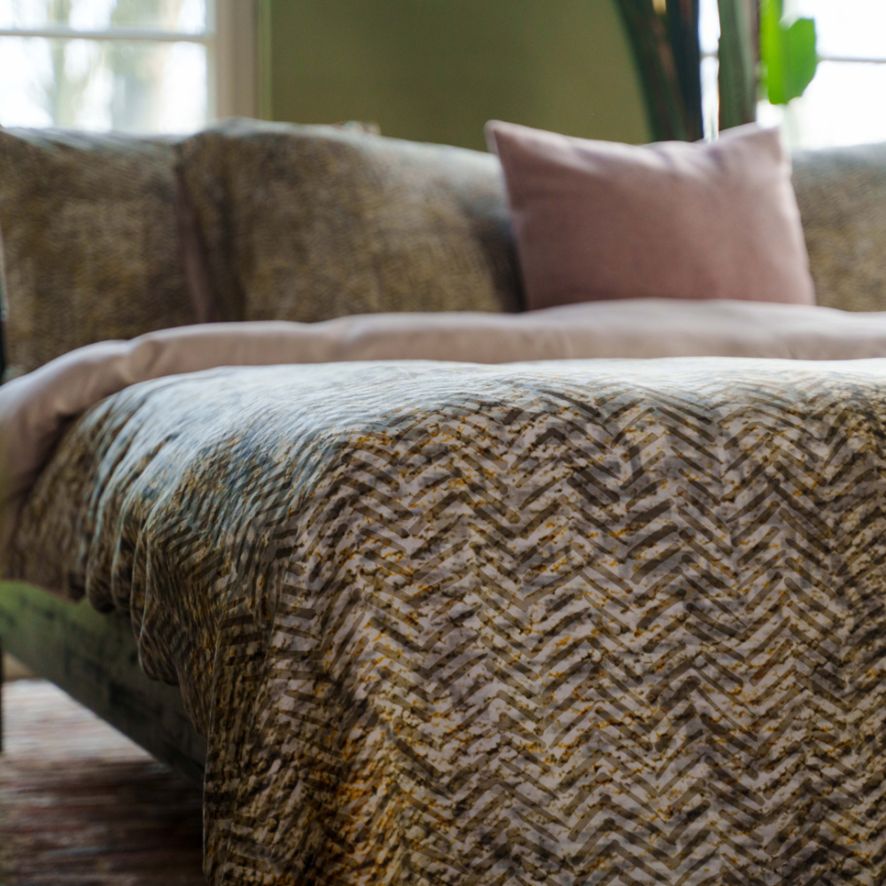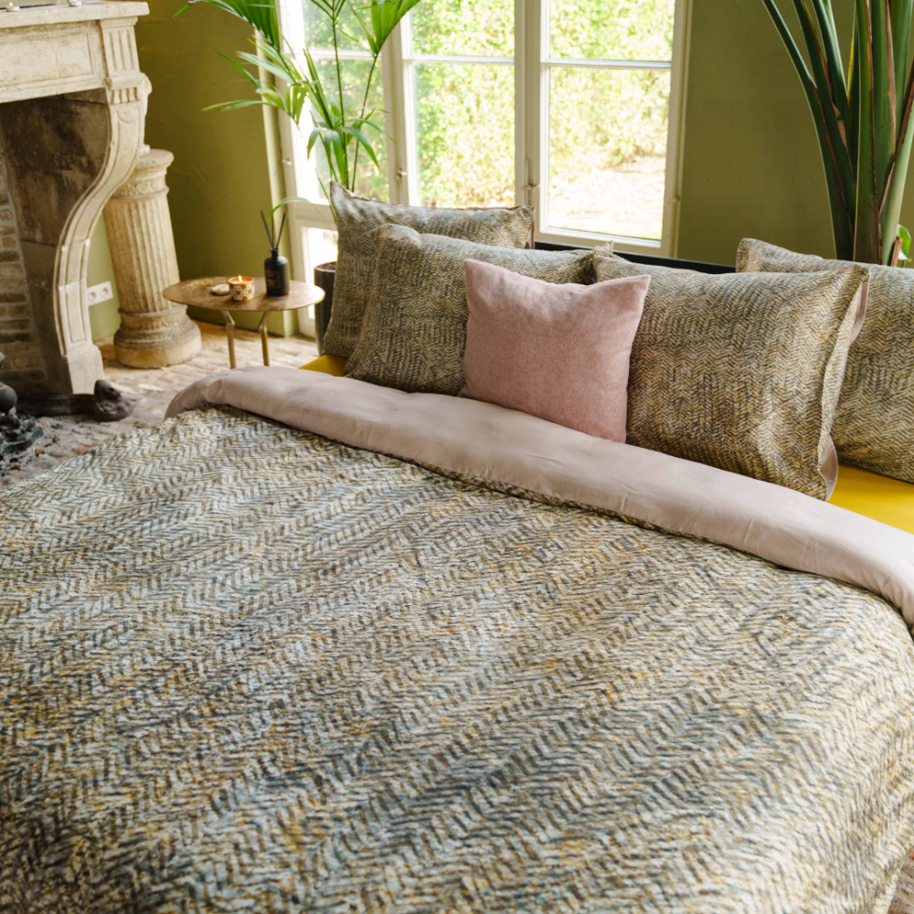 Dekbedovertrek Iwaki heeft een grafische zigzag print met op de achtergrond een verloop van verschillende kleuren. Het overtrek is goed te combineren met een zandkleurig hoeslaken. Om de Ikawi er echt uit te laten springen, kun je kiezen voor een okergeel hoeslaken. Deze kleur komt weer terug in het overtrek.
