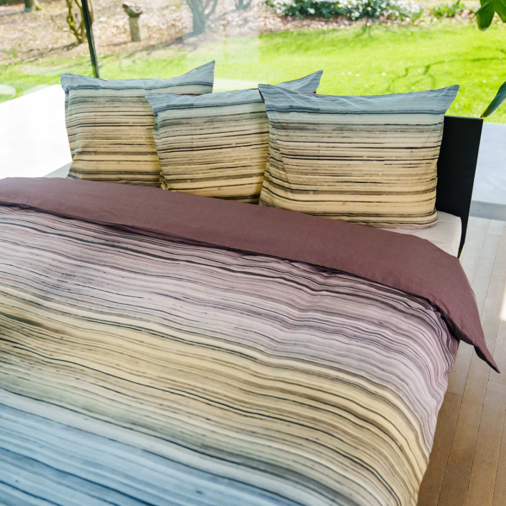Otaru is een dekbedovertrek met een mooi horizontaal lijnenspel. Diverse pastelkleuren, van lila tot geel en blauw, lopen natuurlijk in elkaar over.