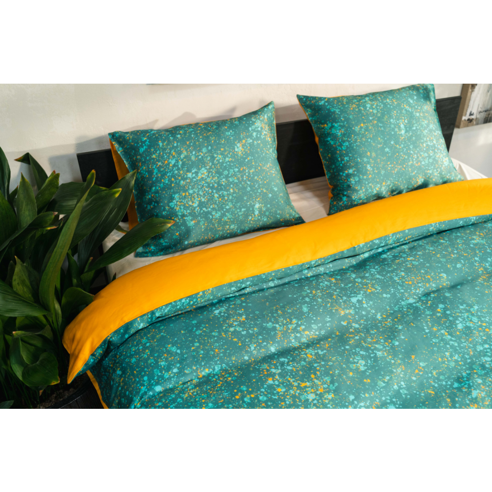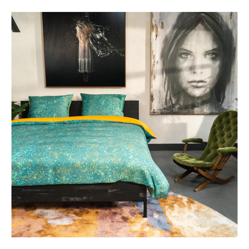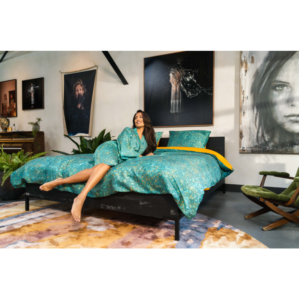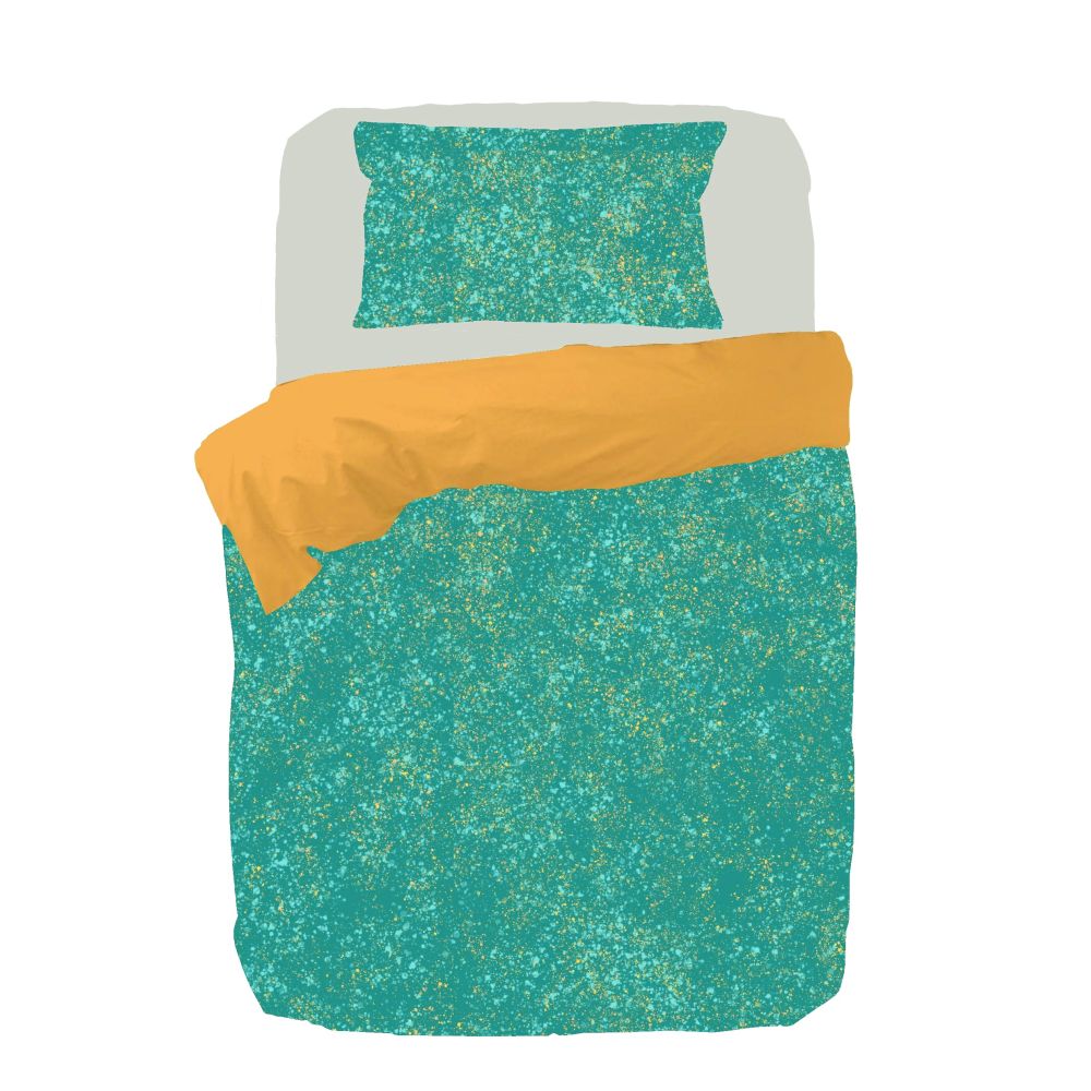 Shinjo is een prachtig speels dessin. De ondergrond van dit dekbedovertrek is fris turqoise, over het gehele overtrek bevinden zich spetters in turqoise- en goudtinten. Het geheel is een subtiel vrolijk dessin. De achterzijde van het overtrek is effen goud.