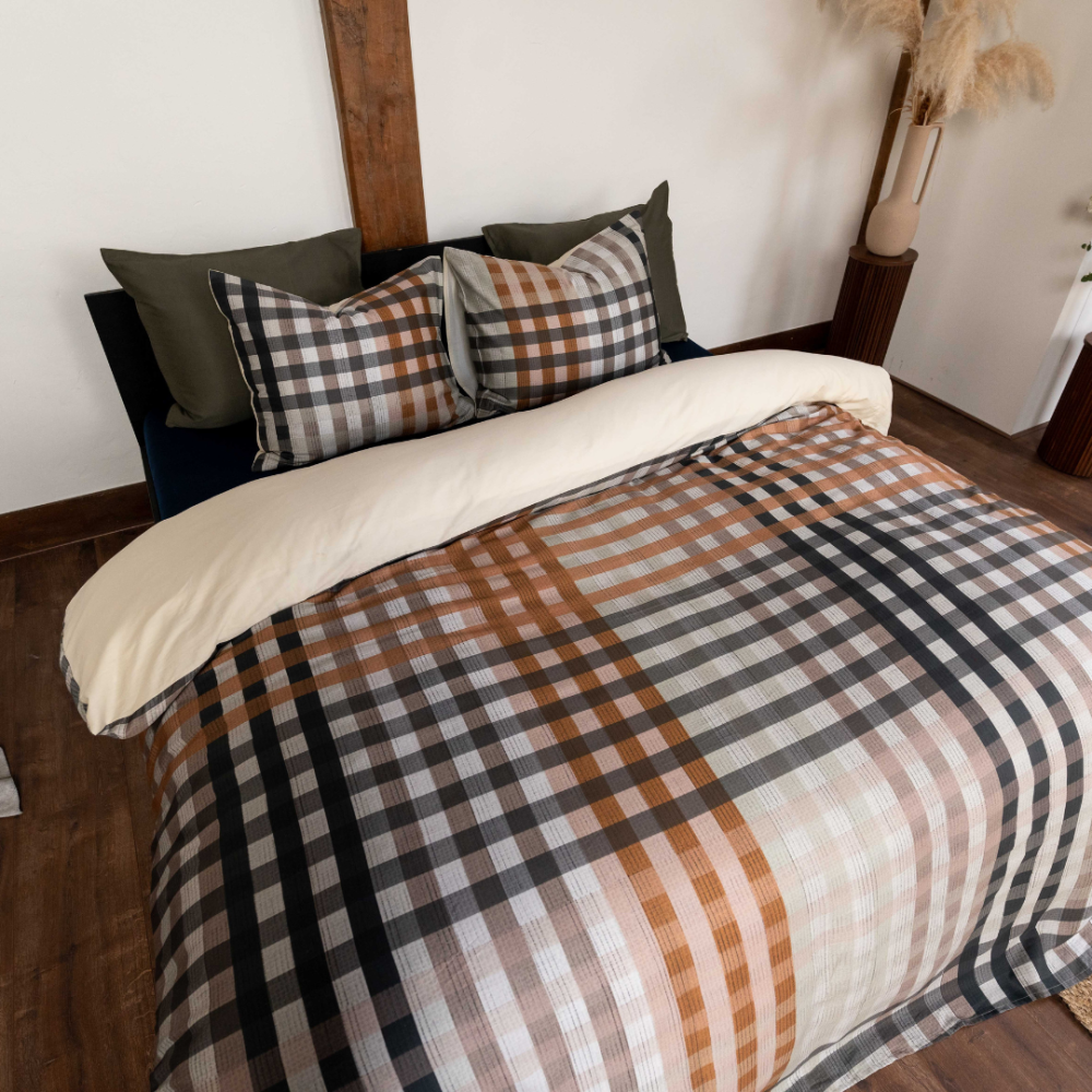 Dekbedovertrek Taru is super cozy en straalt warmte uit. Het overtrek heeft een klassiek gestreepte print met op de achtergrond een extra werkje wat het meer diepte geeft. Warme aardse tinten wisselen elkaar af met offwhite, wat het cozy gevoel versterkt.