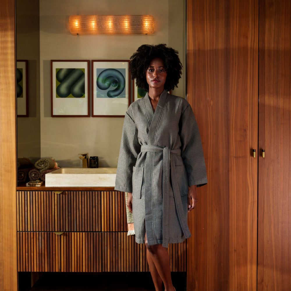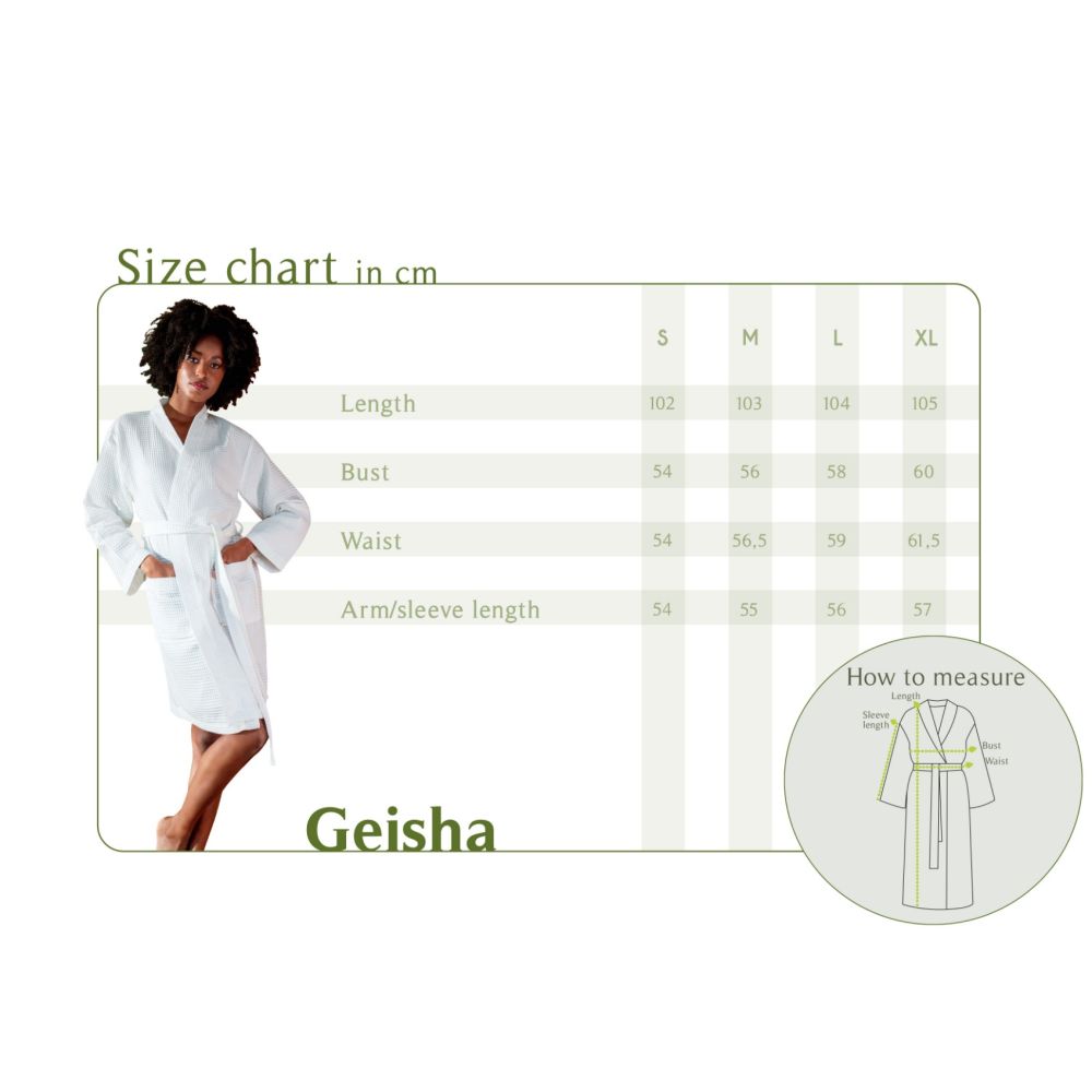 De Kayori Geisha badjas is gemaakt van 100% biologisch katoen. De badjas is geproduceerd volgens de strenge normen van het GOTS-keurmerk. Hierdoor ben je er zeker van dat het product geen schakelijke stoffen en nare chemicalien bevat. De badjas is gemaakt van een prachtige, zachte wafelstof. Deze is zeer absorberend en droogt hierdoor ook erg snel. De badjas heeft een kimono-model en bevat dus geen opstaande kraag. Door de speciale soft-touch finishing voelt de badjas lekker zacht aan op de huid. De badjassen krimpen slechts 3% na de eerste was, waardoor ze erg mooi in model blijven. De badjas heeft 2 handige steekzakken en wordt geleverd in een prachtige zak gemaakt van dezelfde stof als waar de badjas van gemaakt is. Prachtig om cadeau te geven of te krijgen. De badjas is te verkrijgen in 8 verschillende kleuren in de maten S,M,L,XL. Zie bijgevoegde maattabel om te kijken welke maat voor jou juist is.