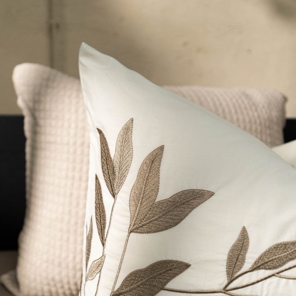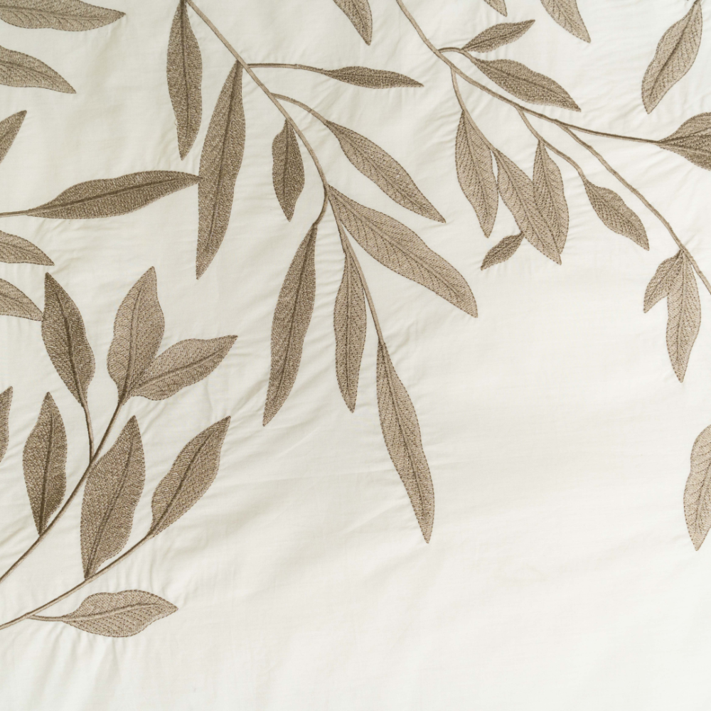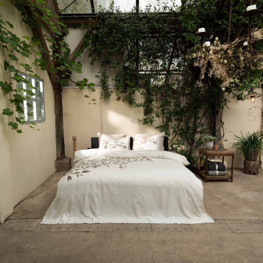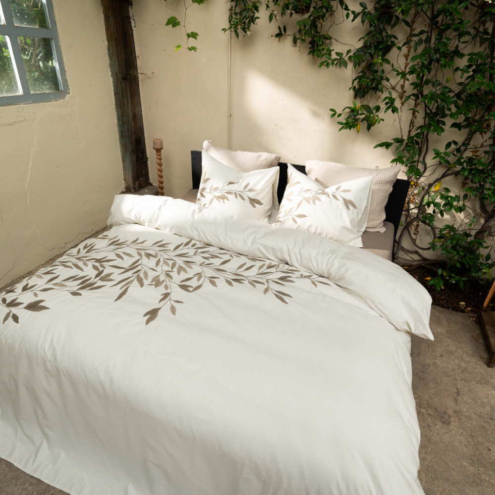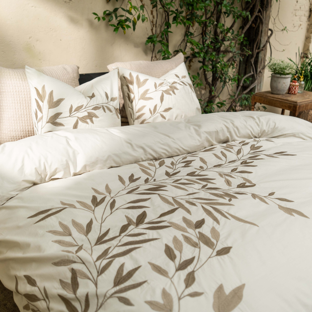 Breng een vleugje natuurlijke elegantie in je slaapkamer met dekbedovertrek Habo. Wat dit overtrek écht uniek maakt, zijn de verfijnde geborduurde details van de sierlijke bladeren. Deze subtiele accenten geven het overtrek een rustieke en tijdloze uitstraling, ideaal voor een serene en stijlvolle slaapkamer. De neutrale kleuren maken Habo eenvoudig te combineren met diverse interieurstijlen.