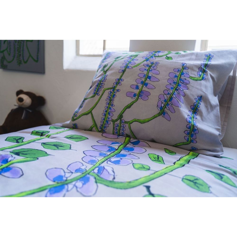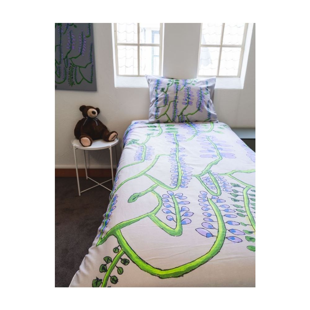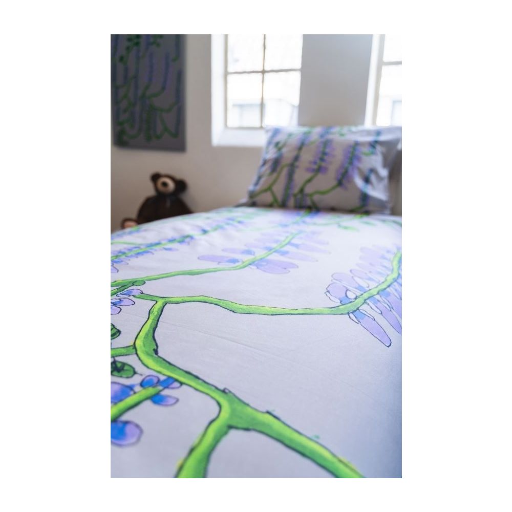 Marleen Willemse houdt van de natuur en van zachte kleuren zoals die in haar ontwerp ‘De blauwe regen’ te zien is. Ze is ontzettend blij en trots dat haar schilderij is gekozen voor op een dekbed. Ze denkt dat mensen gelukkig worden van haar dekbed en er heerlijk onder kunnen slapen. Marleen werkt sinds 2 jaar op het atelier waar ze ook graag reproducties maakt van oude meesters. Dat haar schilderij nu op een dekbed verkrijgbaar is, is de bekroning op haar werk. Ze leeft hier helemaal van op: ‘Wat zal mijn zus hier van zeggen als ze dit ziet?’