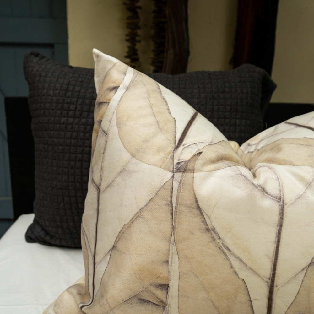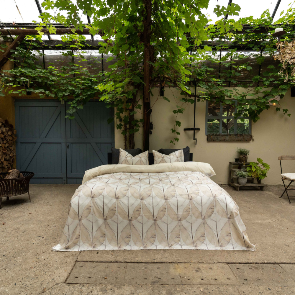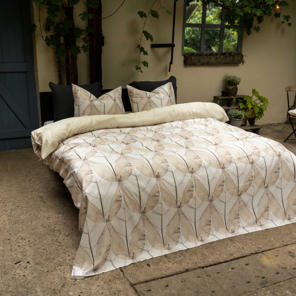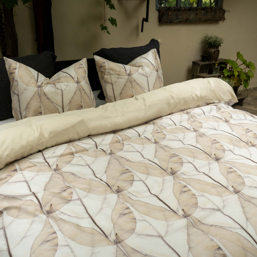 Breng rust en verfijning in je slaapkamer met dekbedovertrek Kushi. Het design van dit overtrek is een subtiele ode aan de natuur, met een prachtige, unieke print van bladeren in lichte naturel kleuren. Deze serene tinten creëren een kalme en tijdloze uitstraling die perfect past in iedere slaapkamer.