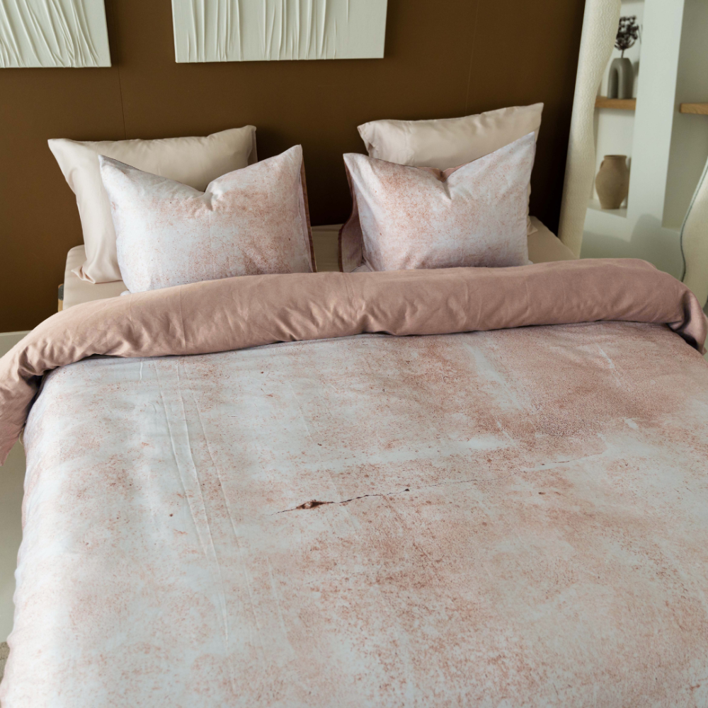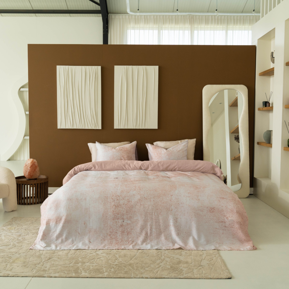 De subtiele nude en beige tinten, met een verfijnd industrieel patroon, voegen een warme en moderne uitstraling toe aan elke slaapkamer.