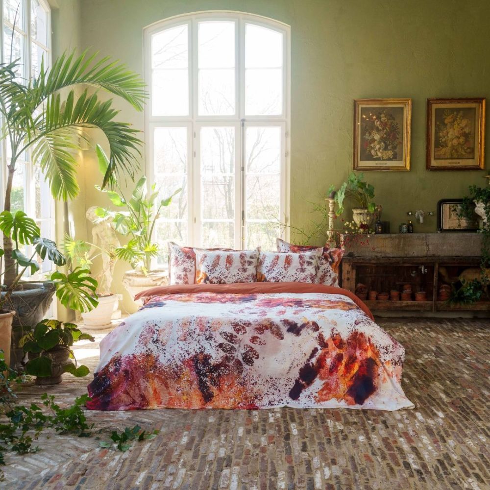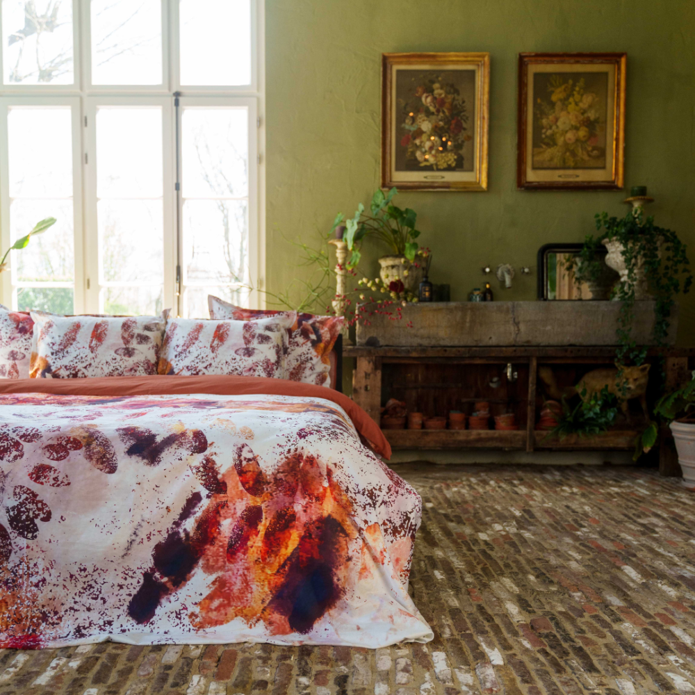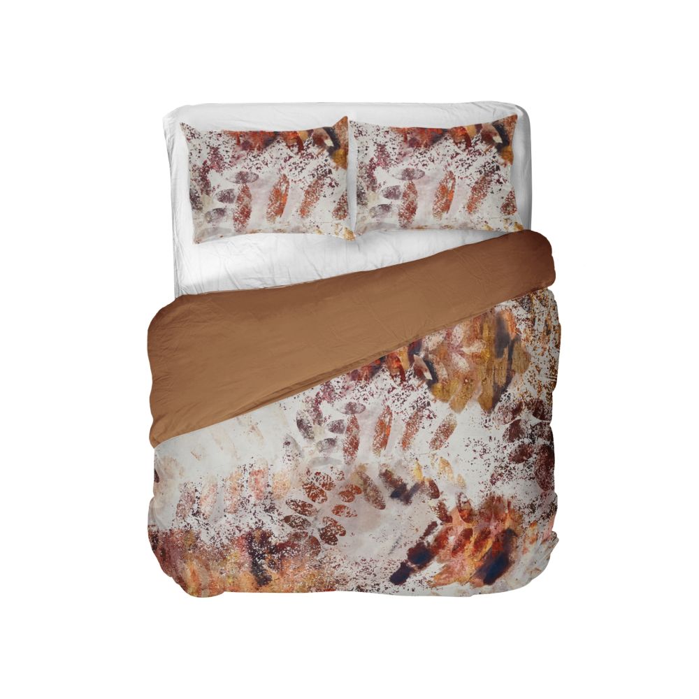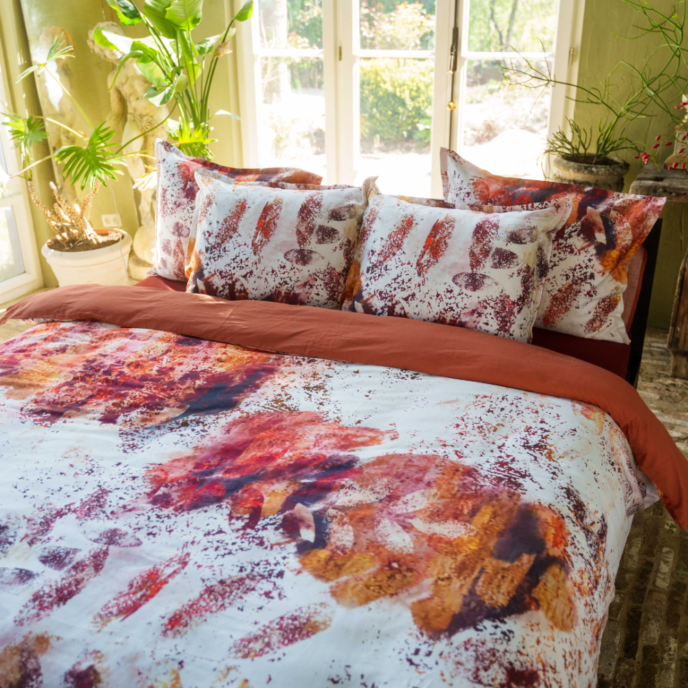 Omachi; een in het oog springend dekbedovertrek! Dit komt door de prachtige kleuren die variëren van diep paars tot fel rood en oranje. Het patroon bestaat uit waterverf achtige vlekken met daar tussendoor speelse bladeren geplaatst. De achterkant van het overtrek heeft een oranje roest kleur.